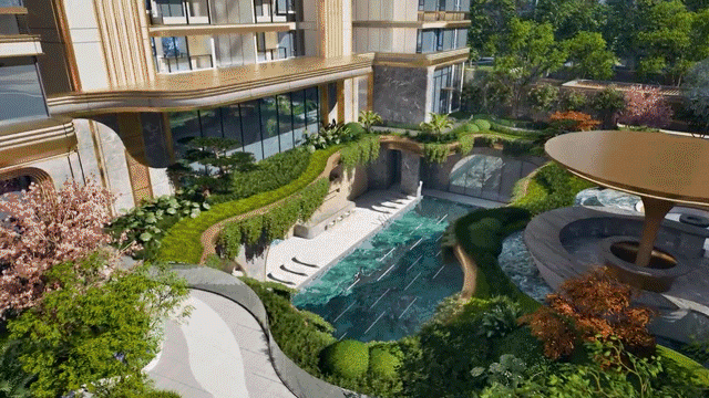 还有未来园林,将结合约4.2米水帘瀑布造景,蜿蜒曲折的溪流叠水景打造;将以普利雅黑大理石全面积铺设,再点缀上金桂、冬青、蓝花楹、红枫等名贵树木,营造一年四季分明的园林胜景。