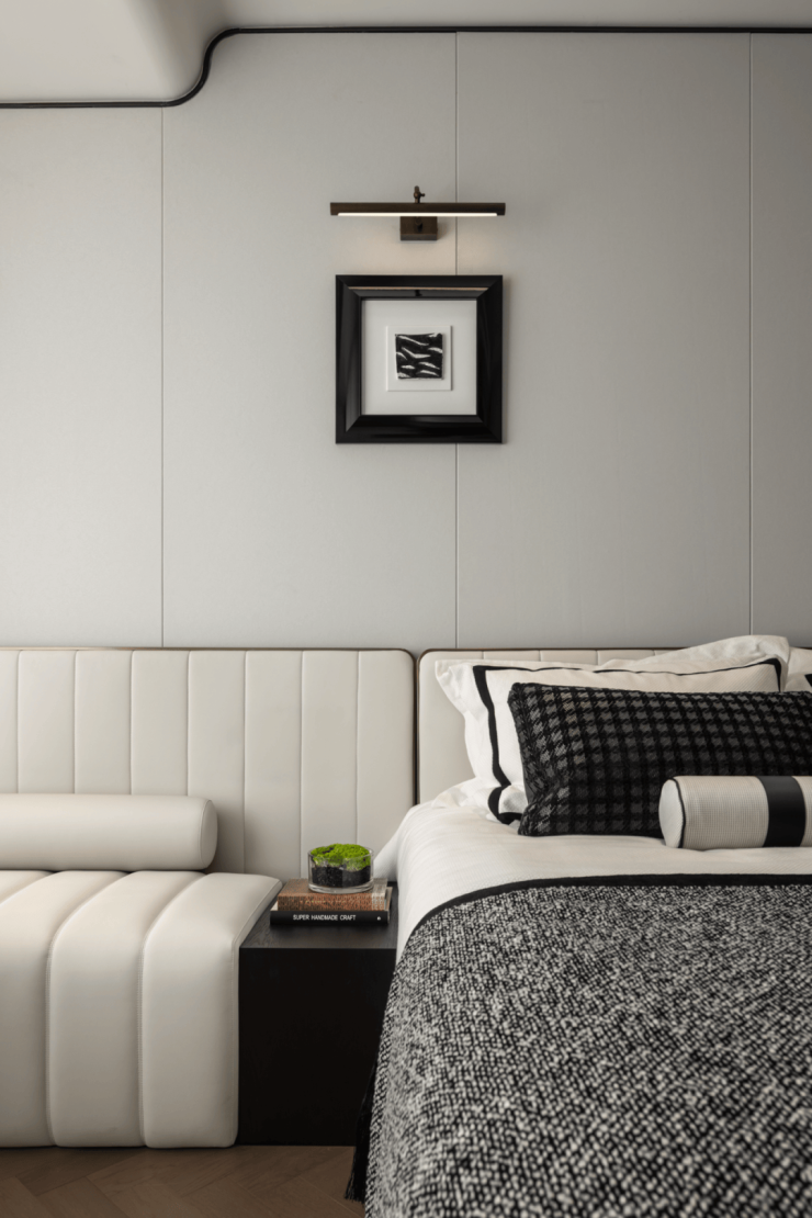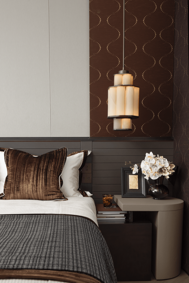 次主卧采用酒店套房形式设计,精心选择的皮质和素色墙布的搭配,造型别致的艺术灯具合乎设计师对“现代精致生活”追求的理念。
