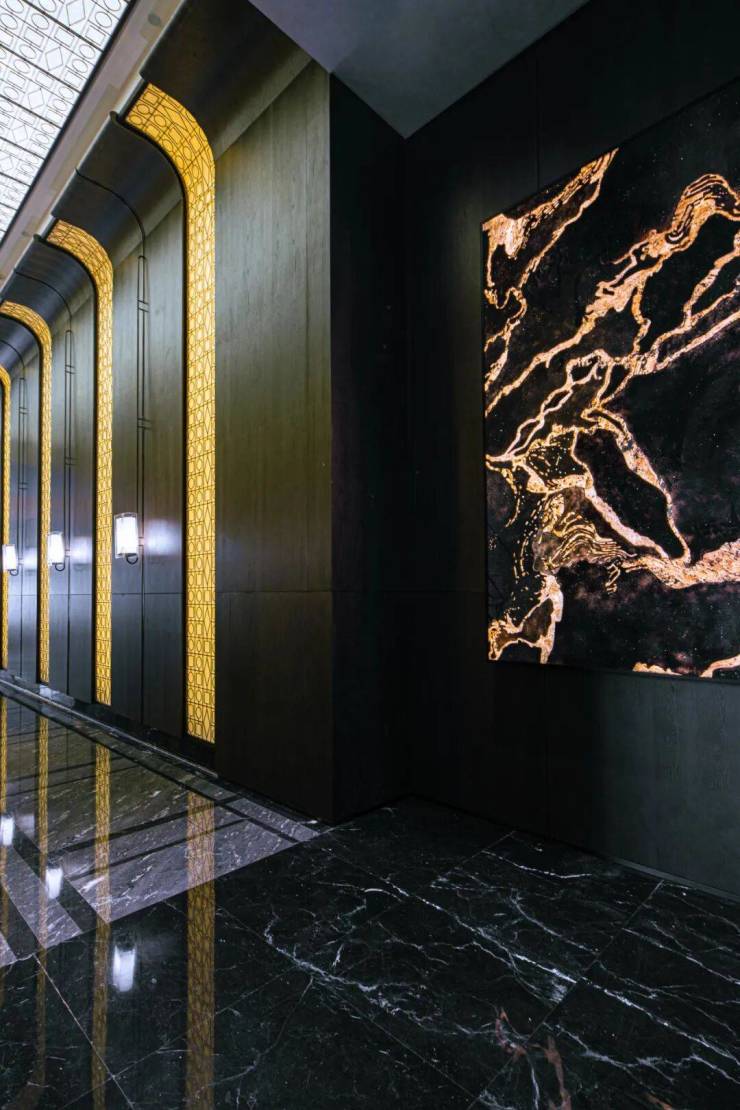 奢石、古铜金属、艺术拼花、定制屏风,奠定了空间现代优雅的设计理念,创造了新的尺度与不同的层次,为艺术预留足够的留白。