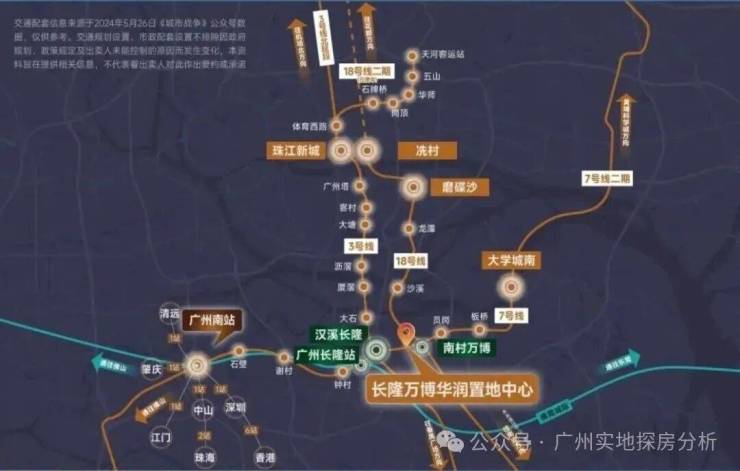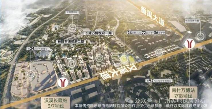 项目一期距离地铁3/7号线汉溪长隆站约500米、距离地铁18号线南村万博站约1.2公里。二期距离地铁3/7号线汉溪长隆站就更近了,下楼就是地铁口。自驾的话小区出门就是汉溪大道可转新光快速和华南快速。