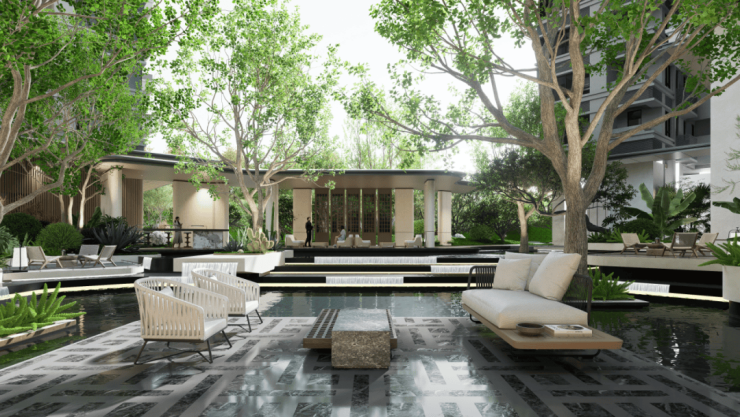 「繁花归宇」景观大堂豁然铺展,“前庭后院“的设计手法,使中心水庭藏而不露;金属屏风汲取了余荫山房玉兰花的设计灵感,通透立面辉映天光云影,精筑门庭以艺术线条勾勒仪式感。花影摇曳,浅水低吟,归家步履被温柔包裹,瞬间卸下尘嚣,心境澄明如洗。