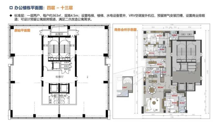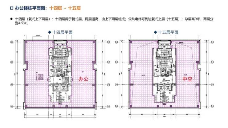 办公楼:层高约4.5米,两梯两户,单套270°三面采光环幕山海城港景观,14楼顶层复式,电梯可上15层。