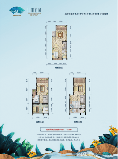 B户型双拼别墅:235-241㎡,赠送57-88㎡负一层,花园面积80-350㎡,总价398-721万