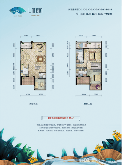 C户型四联排别墅:192-205㎡,赠送104-123㎡负一层,花园面积60-250㎡,总价322-778万