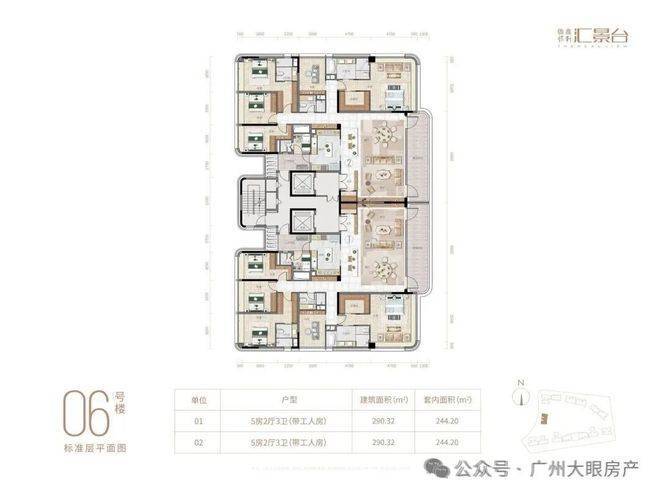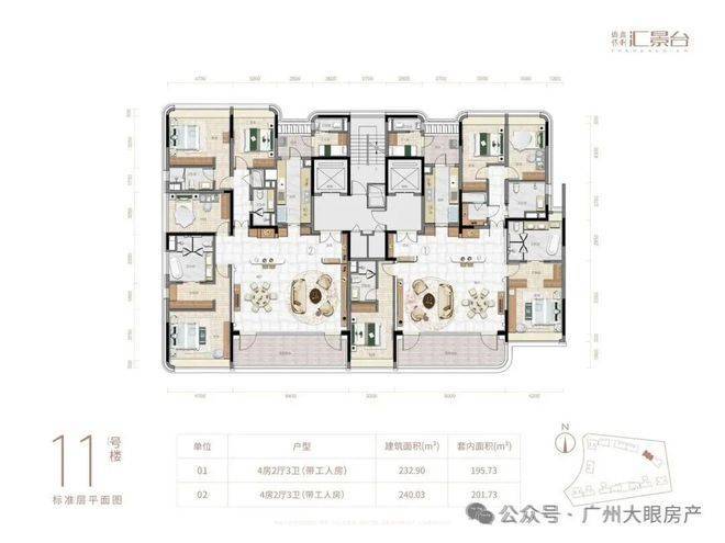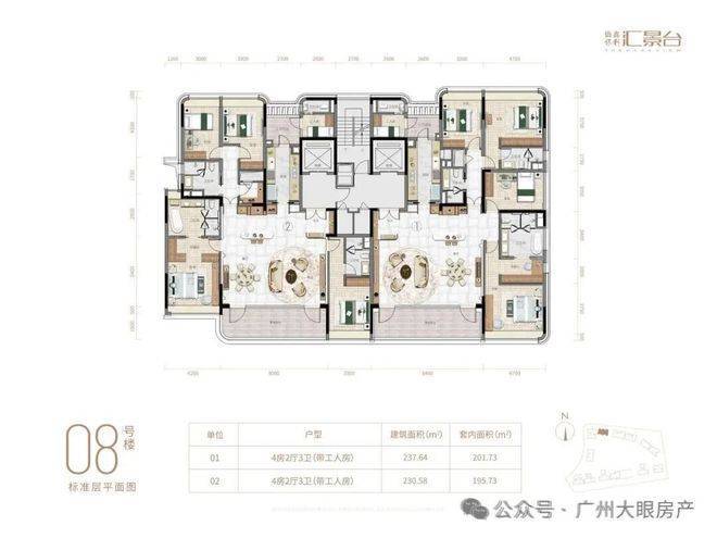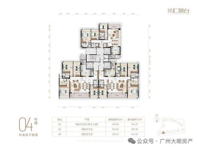 项目由14栋12层小高层组成,产品涵盖123-352㎡三至五房,共8类户型,户型实用率约82-84%