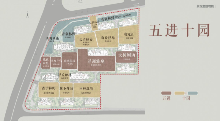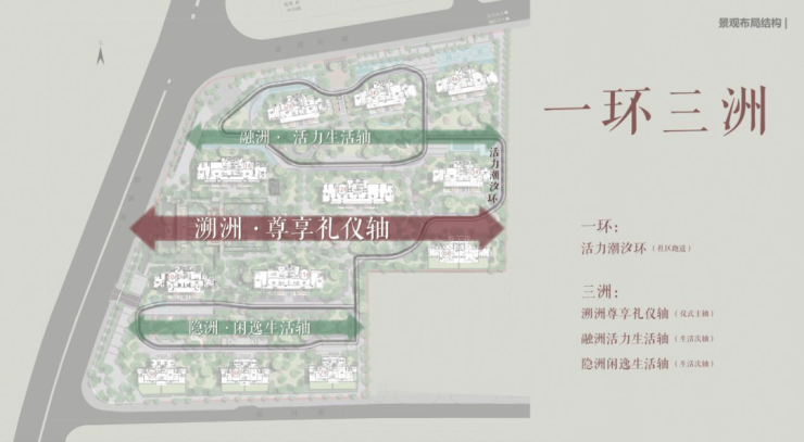 整体景观以"洲岛、宋韵"为魂,通过"一环三洲"架构,五进十园呈现,打造具有岭南基因的现代住区。詹园礼序、中山在地文化与空间结合,以特色植物营造四季画卷,实现具有地域特色的悦系理想人居。