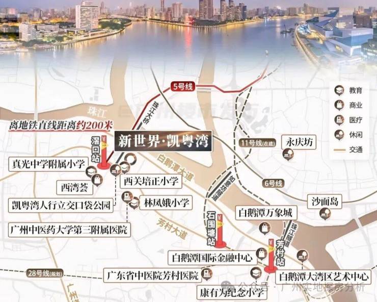 1、地理位置优越:位于白鹅潭核心区,紧邻珠江,与江岸最近距离约50米,可享奢阔江景。项目距离地铁5号线滘口站约500米,步行即可直达,且周边有6号线、11号线(在建)等多条地铁线路交汇,未来还可实现四线换乘,交通极为便捷。