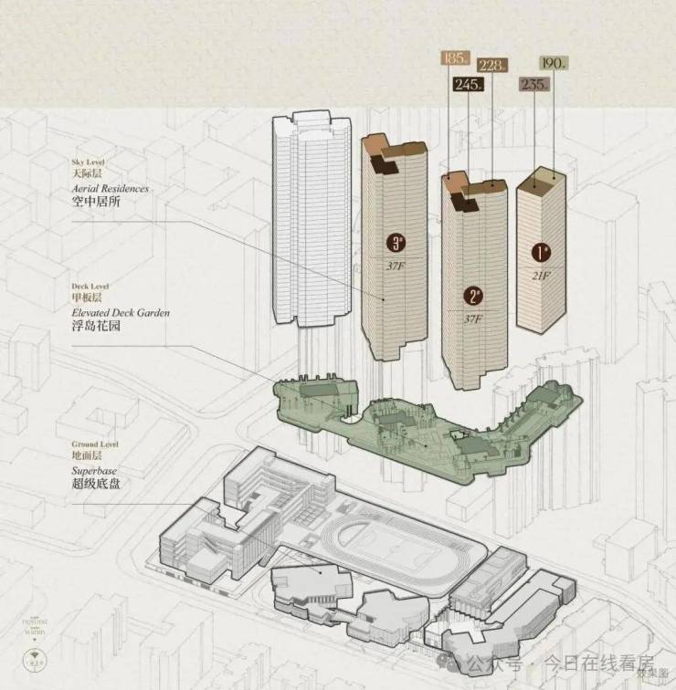 项目以 “浮岛社区” 理念精心打造,采用 “浮岛甲板” 设计策略,四栋住宅坐落于抬升的绿化甲板之上,形成 “超级社区底盘 + 浮岛绿化甲板” 的垂直共生模式 。通过 “仪式水轴 - 艺术庭院 - 空中浮岛森林” 三级景观系统,打造出一个充满诗意的 “垂直森林社区”,让建筑与自然完美融合,仿佛将家安在了公园里,推窗见绿,出门入园 。