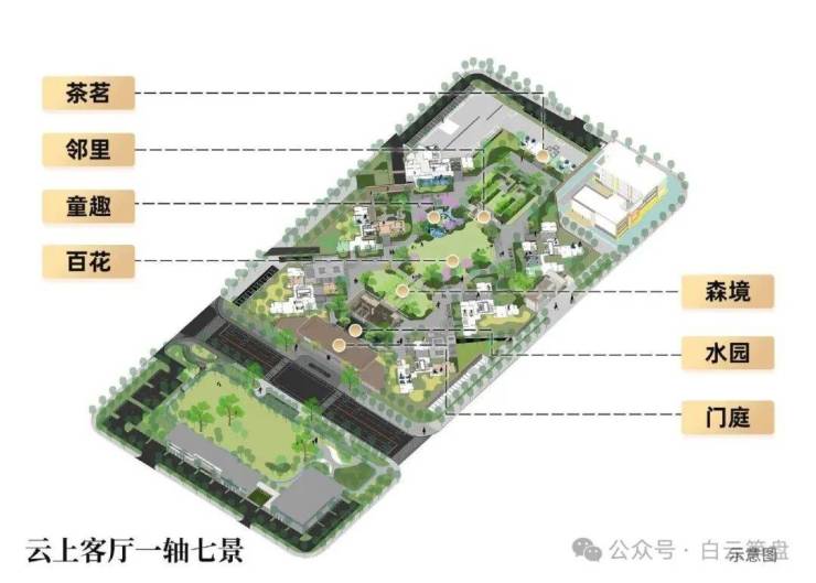 项目社区打造一轴七景,打造中轴景观线超约𝟏𝟖𝟖米项目,都市森屿景观设计,亲近自然时光。