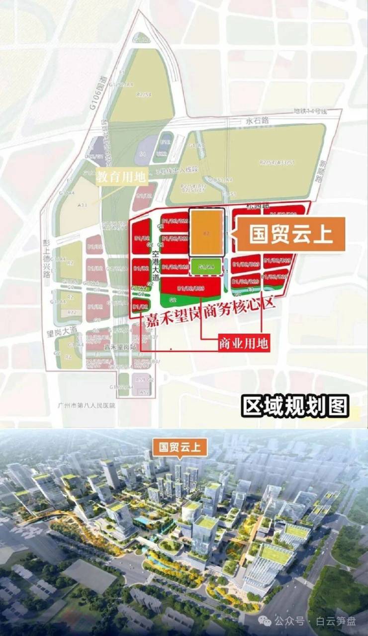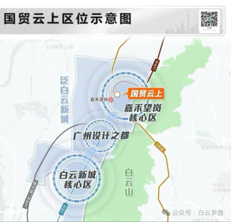 项目位于广州设计之都北延区,又在泛白云新城范围,就在去年,嘉禾望岗商务核心区规划获批,国贸云上将成为板块首发新盘,项目南侧的白云智慧城项目已完成地块收储并启动招商;引入数据科技、智慧电商、智慧医药等风口产业,总投资80亿。