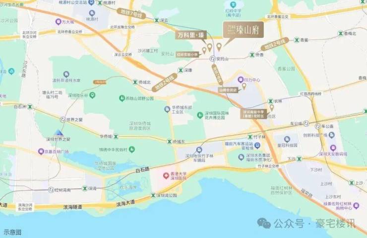 项目所在香蜜湖片区,周边倚靠安托山、塘朗山,与香蜜湖为邻,公园环簇安托山博物公园、梅林山公园、香蜜公园、园博园、儿童公园、燕晗山公园等。以两山一湖六公园的生态格局,拥揽城市绿肺。