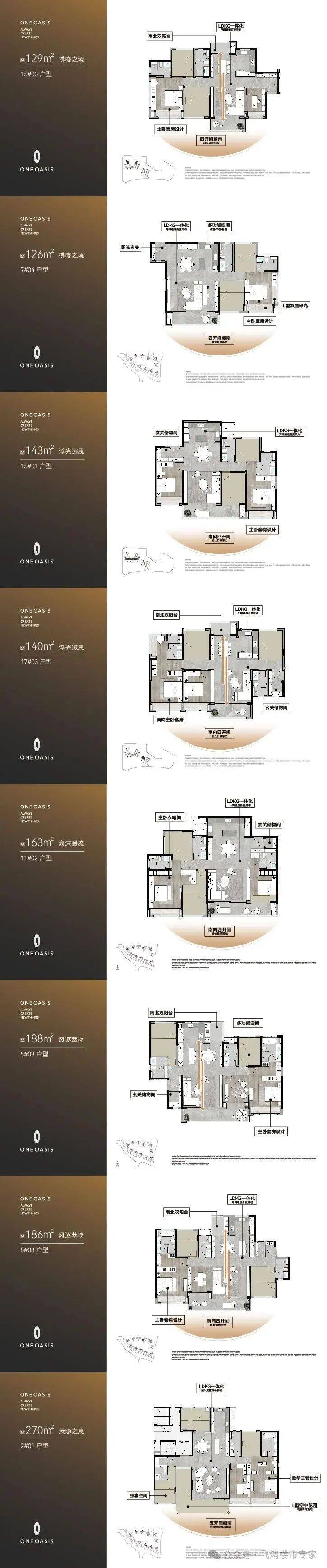 270㎡楼王户型则展现了高端住宅的空间艺术。该户型采用LDKG一体化设计,拥有70㎡客厅、超广角L形空中花园,多套房设计兼顾了家庭成员间的私密性与互动性。