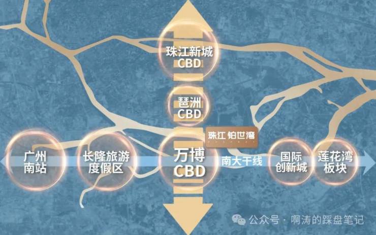 项目地处广州城市中轴&南大干线经济带双中轴交汇点——万博核心,南北CBD塔尖资源一脉尽享。