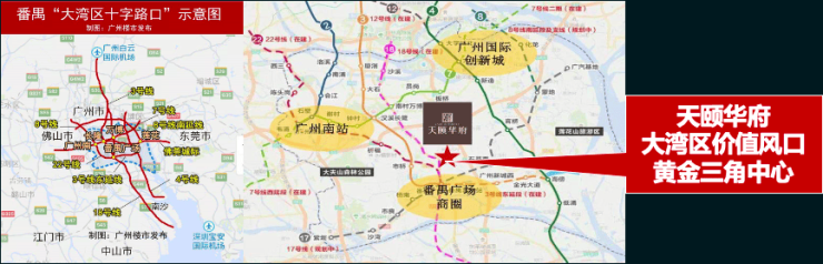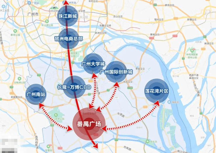 番禺广场、万博商圈 + 广州南站 + 广州国际科技创新城,三者交汇筑就番禺城央黄金三角区域。