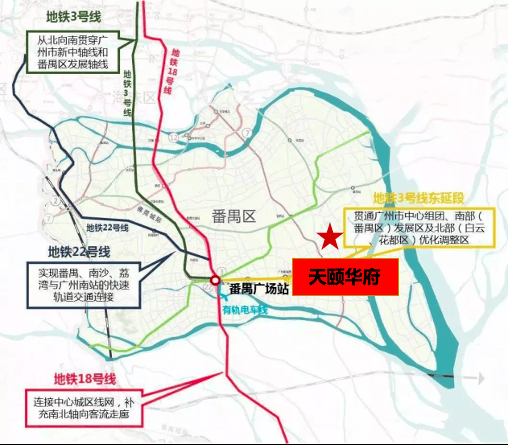 四地铁:地铁3号线,18号线(首段已开通,实现一站珠江新城)、22号线(预计今年通车)、17号线(在建)番禺广场交汇站