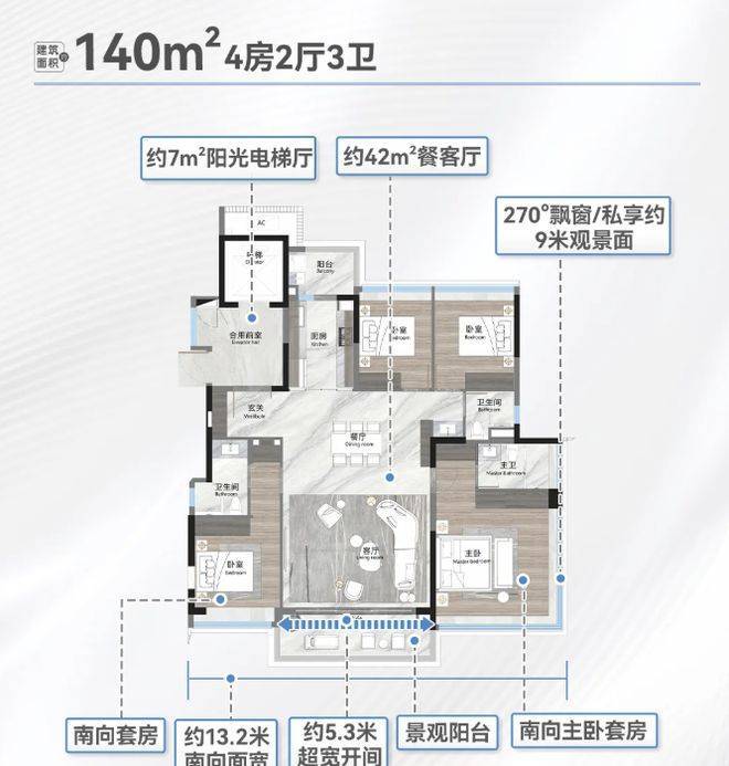 140㎡四房:私梯入户真的太有仪式感了!“四叶草”布局把空间利用到极致,没有浪费的走廊。13.2米的南向面宽,阳光从早晒到晚,客厅、厨房、阳台打通后,形成一个40㎡的家庭社交区,陪娃玩耍、家人聊天都超宽敞。主卧的270°环幕观景窗是点睛之笔,躺在床上就能看湖光山色,科创精英的生活就该这么惬意。