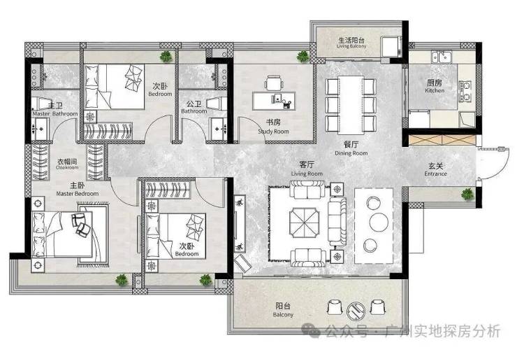 南向户型:主阳台望花都湖及绿轴公园。