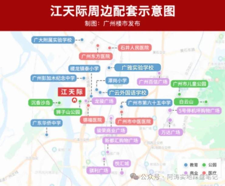 白云广雅实验学校、广大附属实验学校、第65中学(省一级)、槎龙镇泰小学(区一级)、广云外国语学校,项目自身配套幼儿园和少年宫。