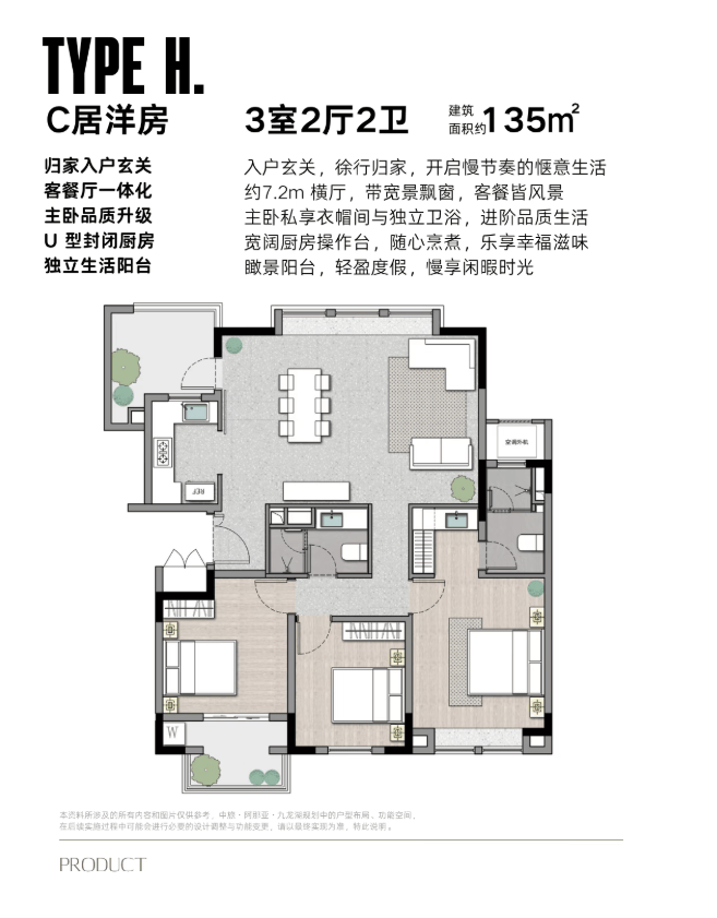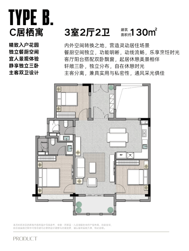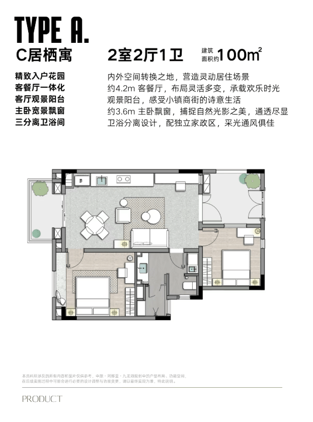 项目在售100-135㎡公寓/洋房,秉持舒适人居的理念,设计入户花园、阳台、飘窗等,与自然连接的空间, 容纳灵动的生活想象,不管是居家抑或度假,都张弛有度。精致的入户花园,打造家里的小森林, 让归家更具仪式感。阔敞的灰色空间, 灵活百变,自定义生活新场景。客厅独立景观阳台,给生活提供了灵动活跃的空间, 可观景、亦可做茶室、花园,安放多元生活品味。阳光、 清风穿堂入室,通透敞亮,连接室外景观,制造更多的浪漫想象。
