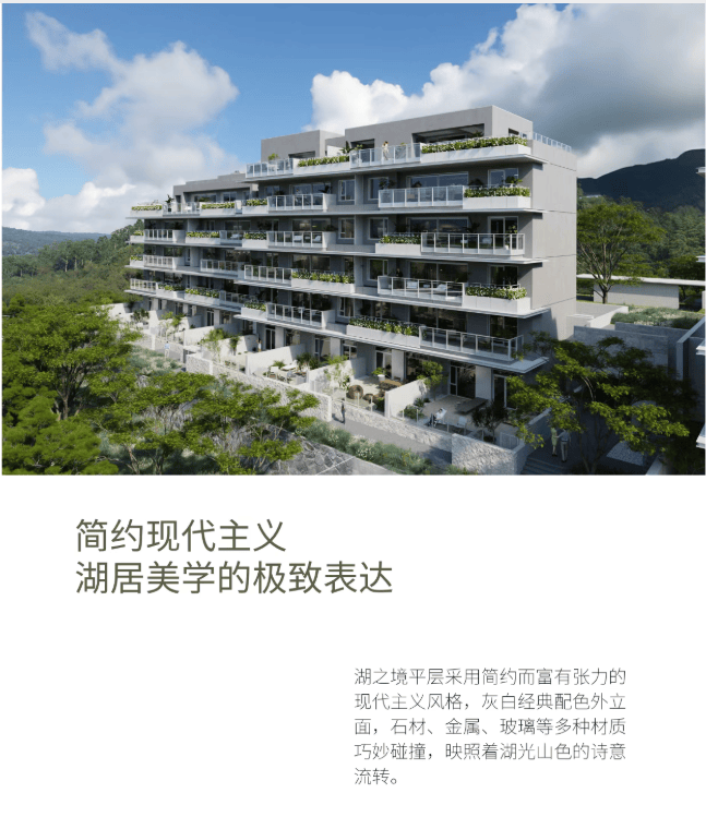 层产品设计▪️采用简约而富有张力的现代主义风格,创造更多与自然对话的机会。灰白经典配色的外立面,石材、金属、玻璃等多种材质巧妙碰撞,映照着湖光山色的诗意流转,舒展流畅的建筑线条构建出力与美的日常。▪️庭间景观、入户水景、宅间花园等景观穿插于楼栋之间,自然与社区生活巧妙融合。多种南方植物与水元素的运用,加之干净留白的设计,构建起与山湖交融的花园空间,为园区带来静谧、纯粹的居住氛围。
