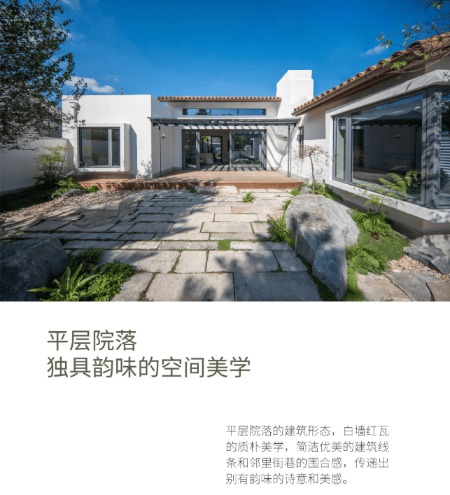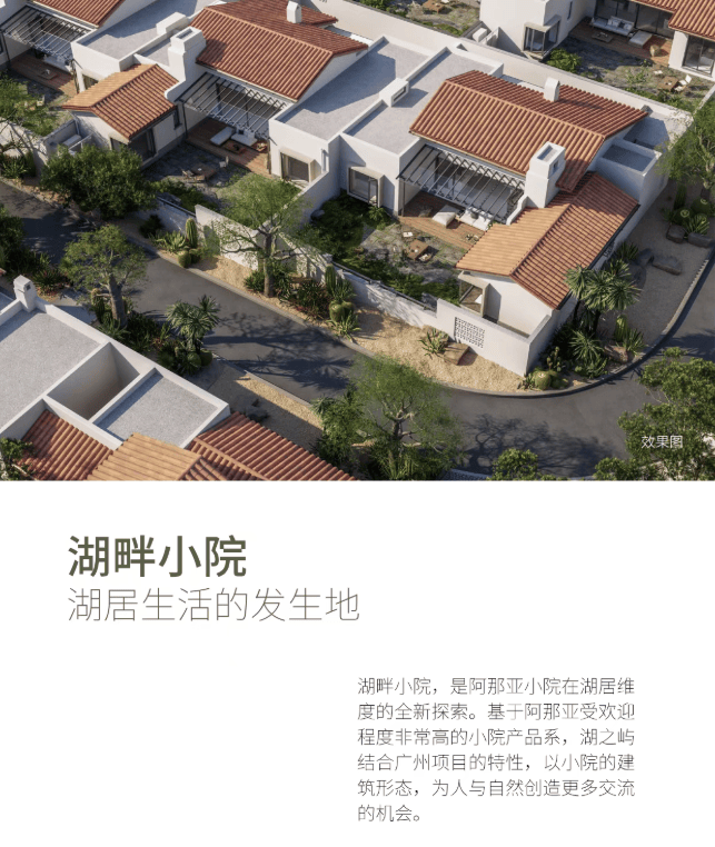 湖畔小院,湖居生活的发生地▪️面积共计可达约98㎡的多重庭院,围绕室内空间灵活分布,每个房间都与室外自由连通,流动的空间,带来通透的采光和灵动的自然光影。▪️湖畔小院,是阿那亚小院在湖居维度的全新探索。基于阿那亚受欢迎程度非常高的小院产品系,湖之屿结合广州项目的特性,以小院的建筑形态,为人与自然创造更多交流的机会。▪️平层院落的建筑形态,白墙红瓦的质朴美学,简洁优美的建筑线条和邻里街巷的围合感,传递出别有韵味的诗意和美感。▪️舒朗的层高,落地窗和高窗,带来 良好的采光和视野。廊架、庭院、 天井,则是基于南方生活的考量, 因地制宜设计的通透空间,身处 其间,感受与自然无限亲近的小院生活。