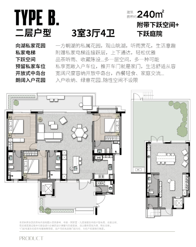 ▪️湖景平层一二层户型,附带下跃空间,并为每户打造专属独立电梯,自如联通家的两端。此外,地下层还设计了宽敞的入户车位,为出行与归家提供私属的便捷体验。