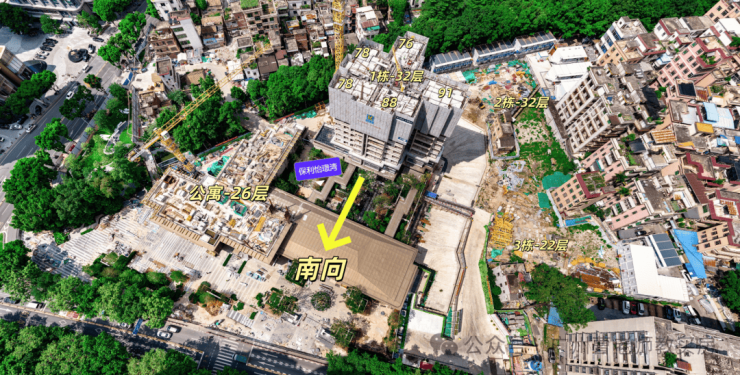 保利怡璟湾共规划3栋22-32层独栋南向住宅,1、2栋为32层高,3栋为22层高,2梯5户设计,总货量406套,1栋西南侧的为26层的公寓
