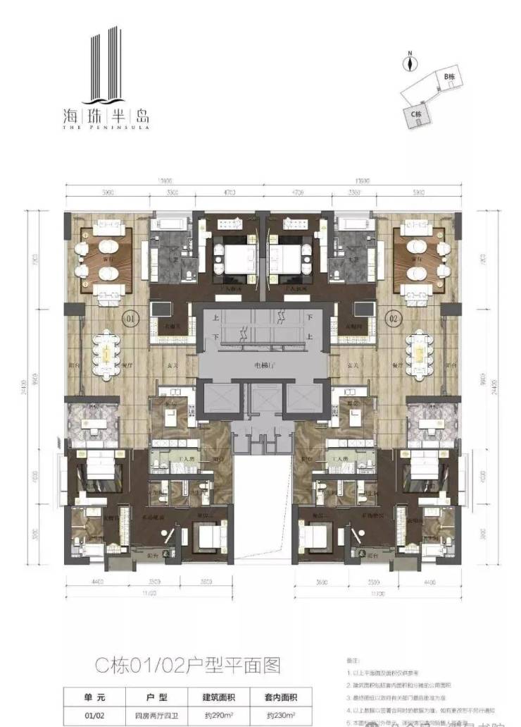 仅有 B、C 两栋 43 层超高层。户型为建面约 290㎡和 315㎡的大平层江景四房,均采用三梯两户的四套房设计,保证了居住的私密性与舒适度,高实用率让空间得到充分利用,满足豪宅居住需求。