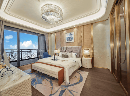 【超极主卧】自然与华丽的大气美学 玄关连接开放式衣帽间,超大收纳空间; 经典八角窗再创新,延展拓宽无限视野,人生超极观景台; 温馨暖黄色调,皮革与墙布搭配,表现朝霞海景之下的吉祥与生命力;