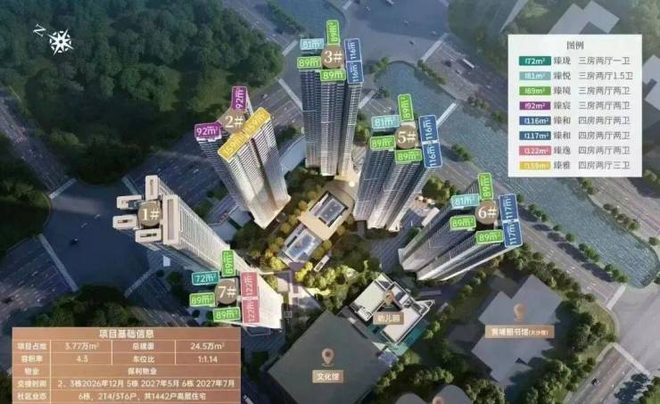 保利招商华发中央公馆采用了围合式设计,6栋47层高塔楼设计,小区自身配建有文化体育场馆和幼儿园,除了2#楼王是两梯四户,其余均为三梯六户,8#是5层高的文化馆,9#是配建3层高的幼儿园。