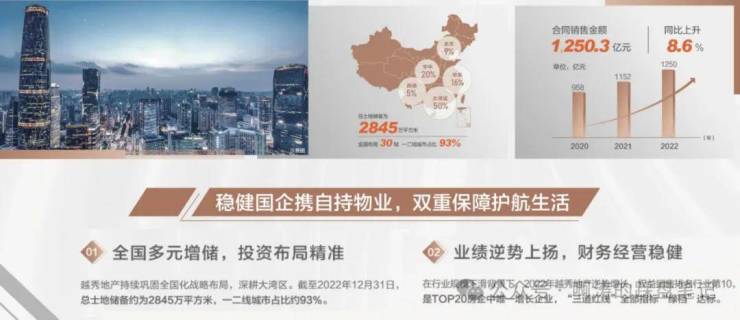 【2022年销售额1250.3亿,蝉联广州TOP1;2023年TOP20房企增长率第1,“三道红线"全部指标"绿档"达标。数据来源:克而瑞】越秀地产1983年成立,是中国第一代商品房缔造者41年长足发展,布局全国超30城,深得超100万业主的信赖