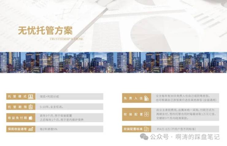 项目入驻寓米酒店管理公司,国际大牌实力有保障,由专业团队运营全方位托管,收益稳健增长,保底收益即可达140元㎡,投资回报率高达5.61%。