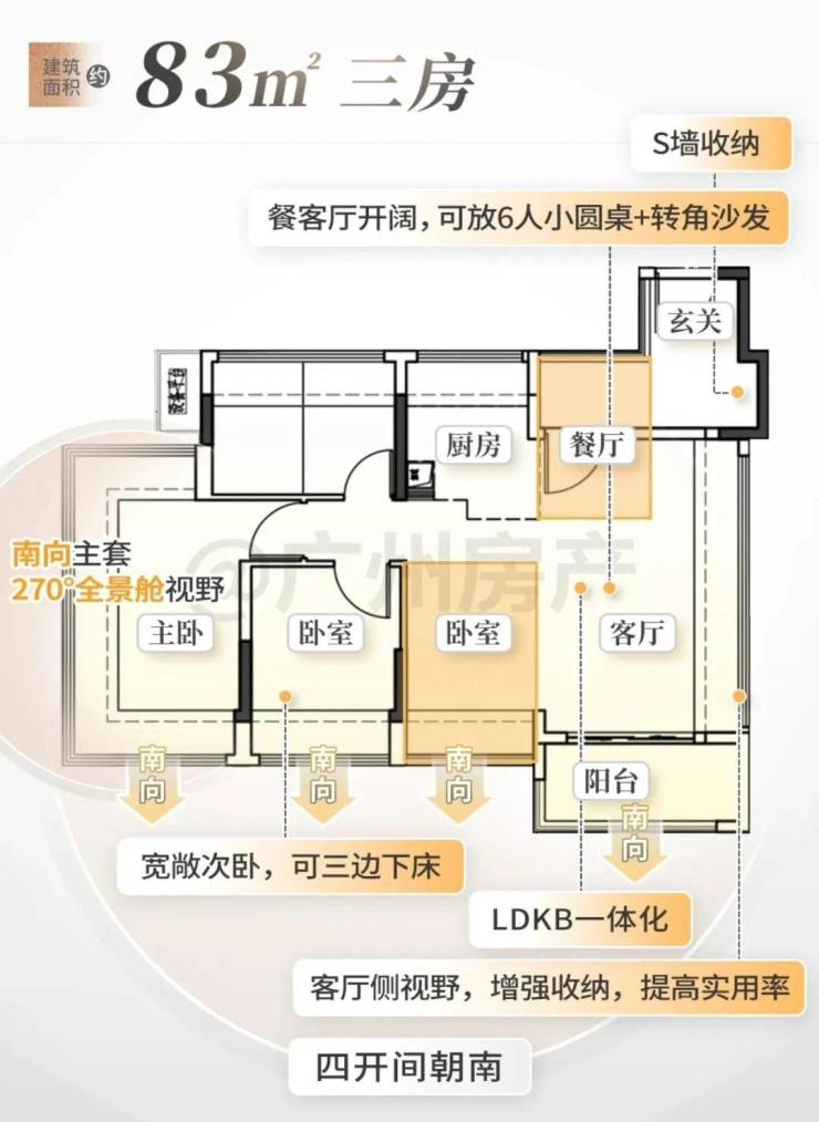 5、户型设计合理:主力户型为建面约83-126㎡的全南向三至四房,采用新规设计,赠送率较高,部分户型主卧带270°环幕飘窗,空间利用率高,采光和通风条件良好,居住舒适度较高。