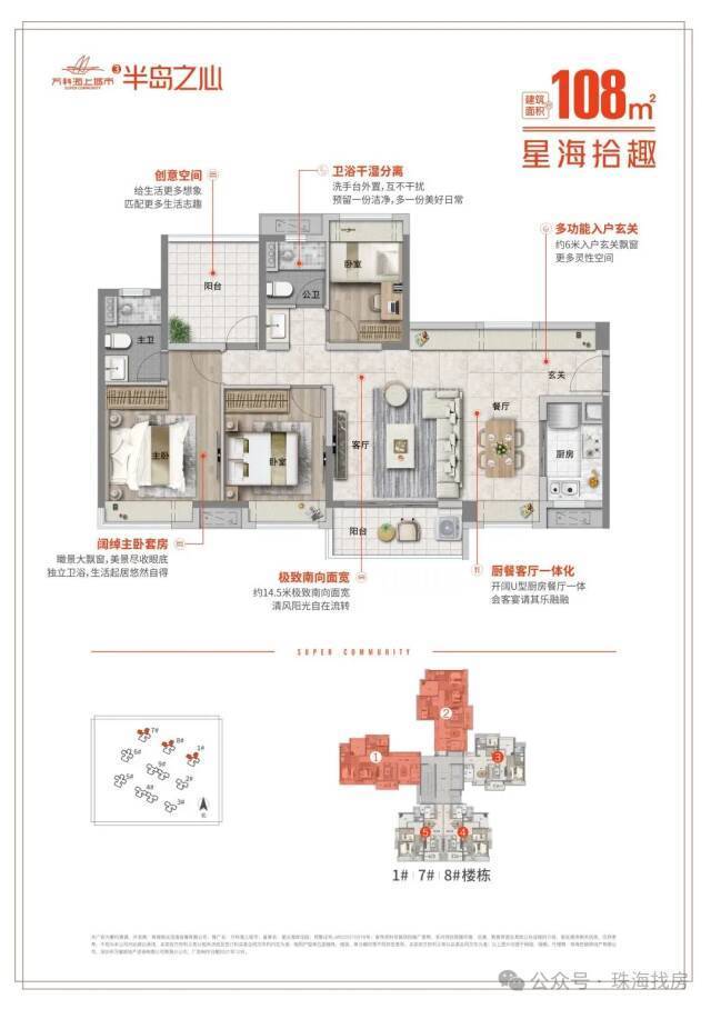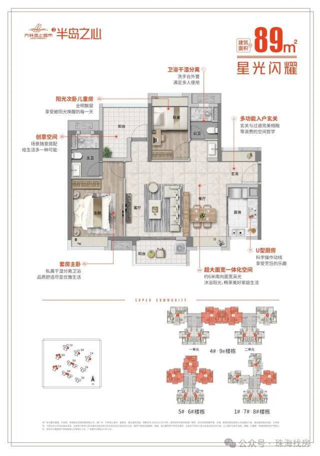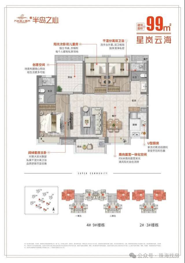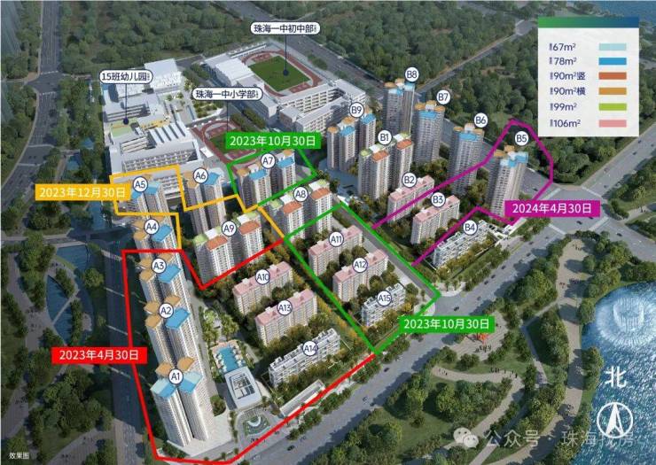 南侧紧邻滨海湿地公园及海景,全南向看滨海公园景观;北面为项目配建幼儿园、广东省重点前五名校 ,珠海一中附小、附中(公立);西面为项目约1.5万方商业(亚朵已开业、肯德基、华润万家即将开业)、约4万方邻里中心;