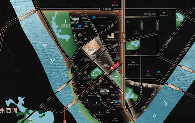 中盛遂晴府位于惠城江北菊花头片区,临东江,距华贸天地约 1.2km,地处江北文华一路边上,处于惠州江北 CBD 核心地段。周边生活配套异常完善,一路之隔有富民小学,直线 1 公里范围内还有惠州一中江北校区、东江高级中学、金裕小学等多所学校,能满足孩子全龄段的教育需求。佳兆业中心、市图书馆、市民公园等配套设施也皆在周边,居民吃喝玩乐购一应俱全。此外,项目紧邻三新北路主干道,交通出行十分便利。可以说,该楼盘占据了城市核心地段的区位优势,无论是生活氛围还是发展潜力都十分可观。