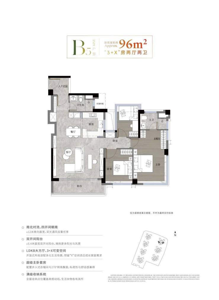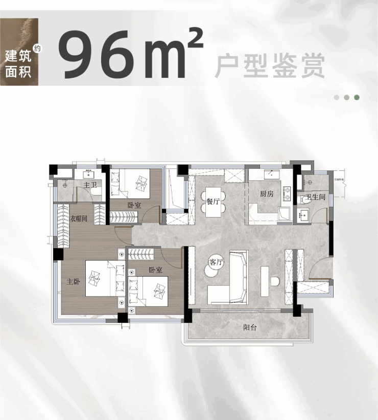 【建面约 96 ㎡ 3+X 房两卫】建面使用率高达 110-118%(套内使用率 138-148%),使用面积约 111-115 ㎡,