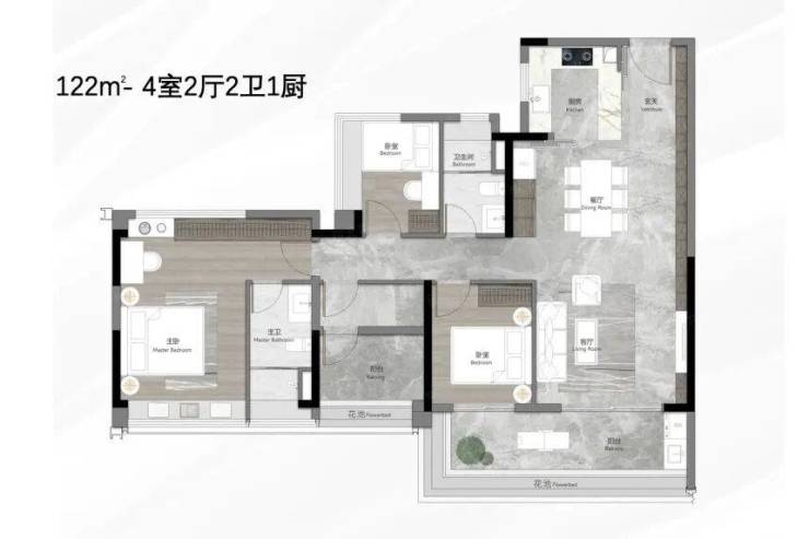 122㎡户型做到 4.5 开间朝南,南北对流,主卧带独立卫浴,双面宽阳台兼顾晾晒与观景;