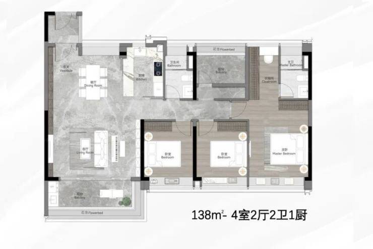 主套房带衣帽间和独立卫浴,空间布局宽松,适合多人口家庭或改善需求。