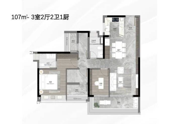 107㎡的三房两厅两卫是刚需适配户型,总价约 749 万元,剩余少量尾货