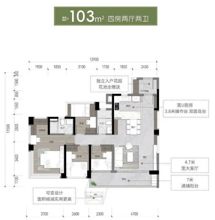 105㎡户型:南北对流大方厅,客厅面积可扩至23㎡,三代同堂无忧
