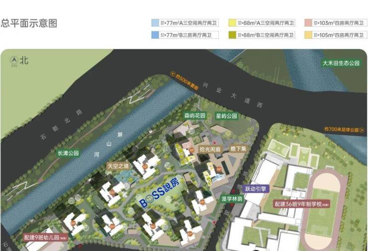 项目首推北组团1、9栋,也是最靠近兴业大道的两栋,首推面积从77、88、98、105平,后期还有更大的135平,产品设计使用率高达127-138%。