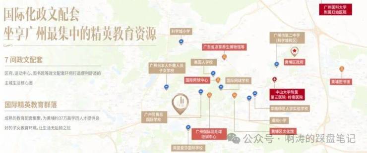 教育——项目3公里范围内集聚市二中、爱莎国际学校、贝赛思国际学校、华南师范大学附属黄埔实验学校(南校区)、美国人学校等多所国际院校,营造双语教学环境,培育与国际接轨的菁英人才;