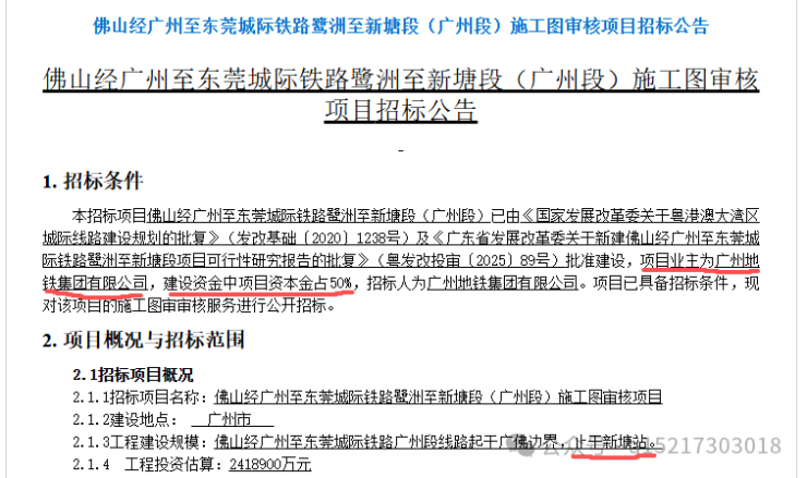9月16日,佛穗莞城际广州段同步启动3个招标,包括施工图审核、规划测量、控制测量及施工测量检测工程项目。招标公告显示,线路已获得《广东省发展改革委关于新建佛山经广州至东莞城际铁路鹭洲至新塘段项目可行性研究报告的批复》,项目业主为广州地铁集团有限公司。