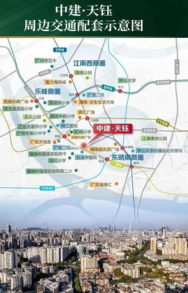 中建天钰坐拥双地铁,位于广佛线燕岗和石溪两个地铁站之间,步行距离分别是750米和900米,目前开通的是广佛线,燕岗站同时是大环线11号线的站点,去海珠琶洲、天河、越秀等核心板块都很方便;