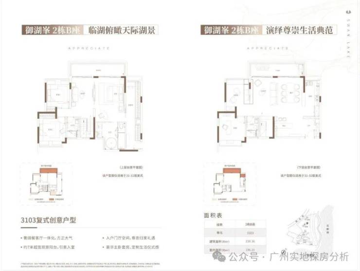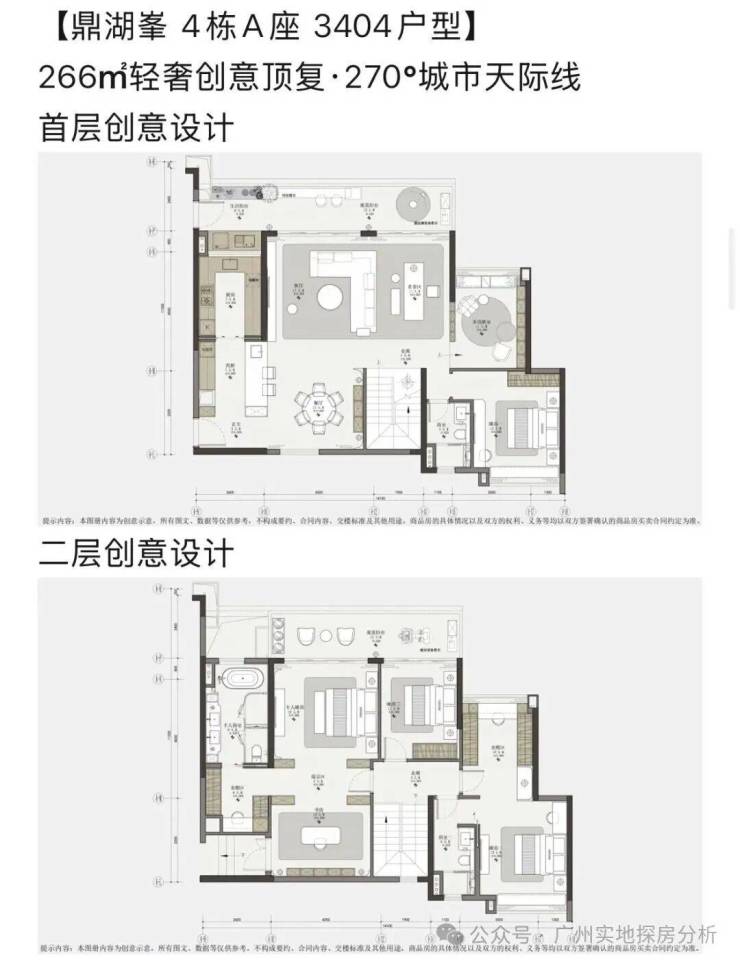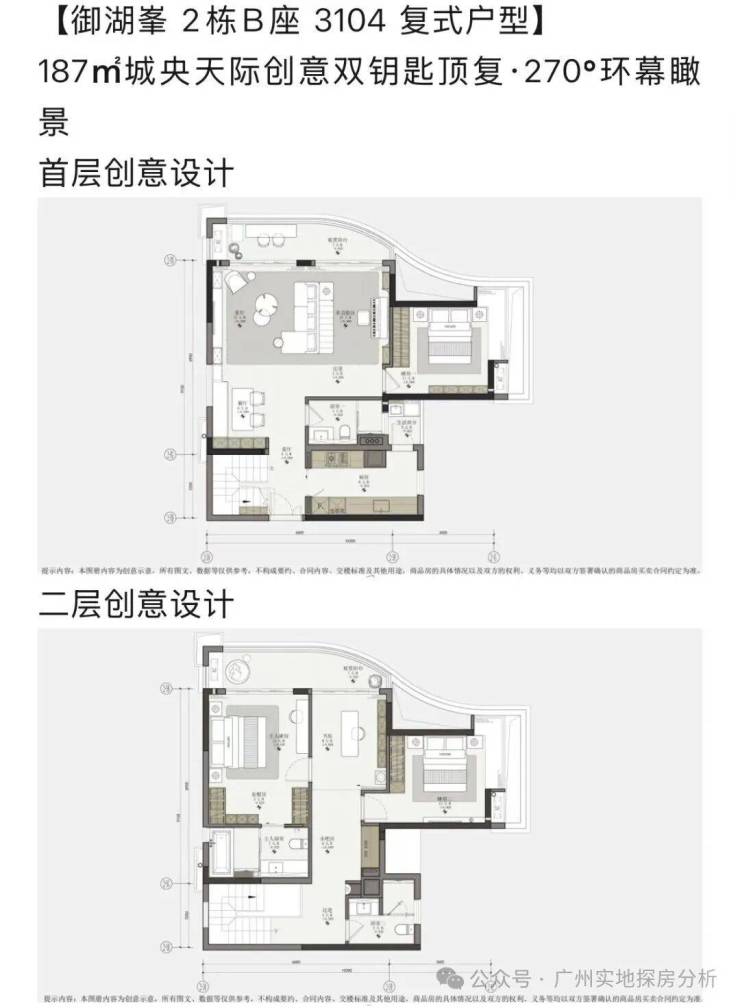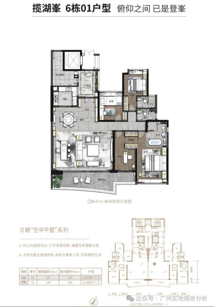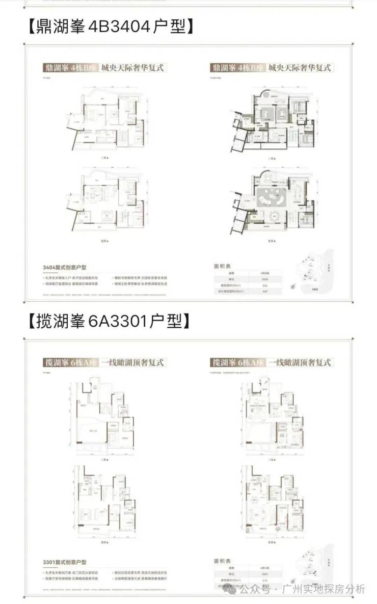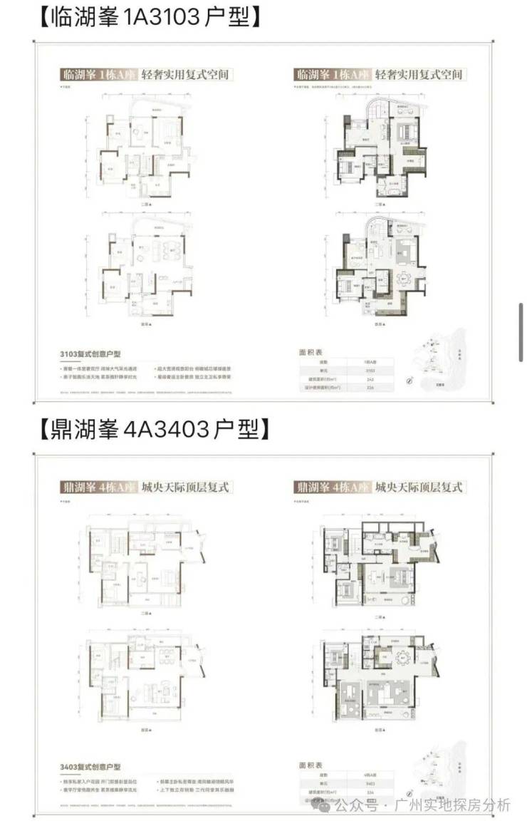 户型多样:涵盖建面约83-247㎡二至五房平层,以及185-826㎡瞰湖复式、顶复产品。其中,大平层户型多为南向一线望湖,复式产品以“双钥匙双入户”设计为亮点,兼顾隐私与仪式感。