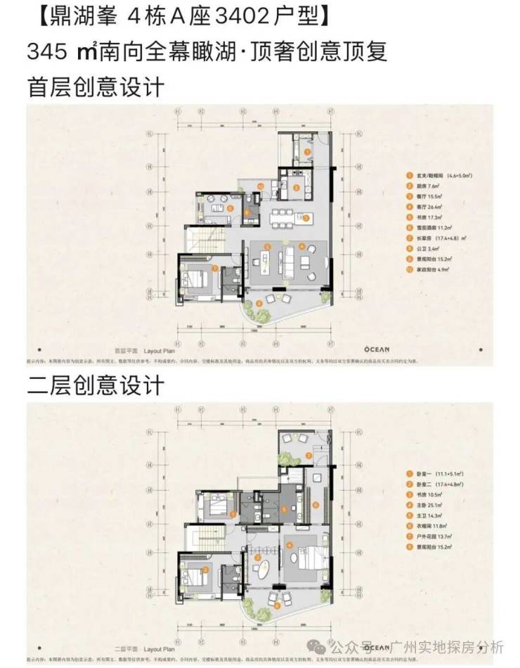 空间设计:注重尺度与功能融合,如约345㎡顶复配备约59㎡南向客厅、约7.2米双层挑高、约8米环幕阳台,主卧套间含衣帽间、景观浴缸;约438㎡复式打造“家庭社交中枢”,配备影音室、品酒区等功能空间。