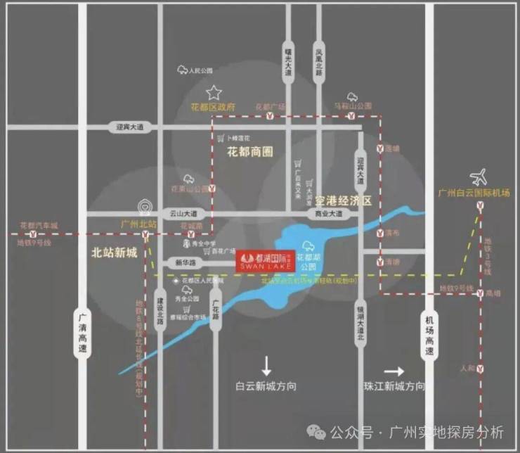 地理位置:地处花都区花都湖畔,新华路96号,占据花都CBD中轴核芯位置,紧邻花都湖国家湿地公园(约4300亩),与白云国际机场、广州北站形成“空铁双枢纽”格局,交通便利。