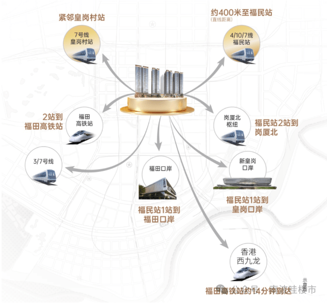 ·1站双口岸 ·2站福田高铁站 ·2站岗厦北枢纽 ·双地铁口 四地铁线