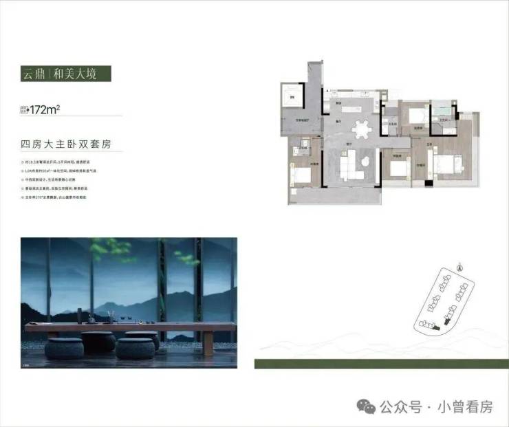 172㎡|四房大主卧双套,约18.5米奢阔总开间,5开间向阳,通透舒适,LDK布局约50㎡一体化空间,阔绰格局彰显气派,主卧带270°全景飘窗,云山盛景尽收眼底