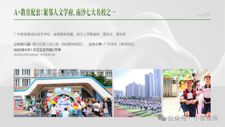 公办幼儿园-南沙区第三幼儿园(海语熙岸园区)、公办小学-广外滨实(海语校区)2023年9月1日已正式开园/开学(具体招生条件以政府部门发布政策为准)。